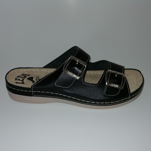 Ledi Anatomic Férfi Papucs LEDI-804-10. Színe: feketeA belső talp rész puha bőrből készült, alatta a láb anatómiájának megfelelő emeléseket, tartó pontokat tartalmazó párnázat található, ami kényelmes akár 24 órás viselést is lehetővé tesz.A természetes bőrnek és a pántoknak köszönhetően nyitott jól szellőzik, és a láb nem izzad be.Viselése ajánlott nehézláb, lábégésben szenvedők részére otthonra és utcára i