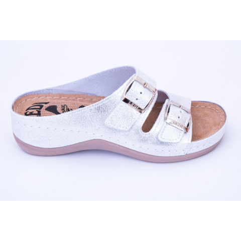Ledi Anatomic Női Papucs LEDI-404-S1. Színe: ezüstAnatómiailag tervezett, tartós, könnyű, kopásálló PU talp a láb igénybevételeit figyelem be véve készült és rugalmas járást tesz lehetővé. A belső talpbélés puha bőrből készült, komfortos és rugalmas alapot biztosít a fáradt, fájós láb számára. A talpágy kialakítása kényelmes akár 24 órás viselést is lehetővé tesz. A láb nem ég és nem izzad meg viseléskor. Aj