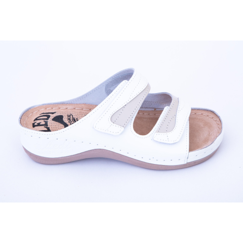Ledi Anatomic Női Papucs LEDI-412-18. Színe: fehér-bézsAnatómiailag tervezett, tartós, könnyű, kopásálló PU talp a láb igénybevételeit figyelem be véve készült és rugalmas járást tesz lehetővé. A belső talpbélés puha bőrből készült, komfortos és rugalmas alapot biztosít a fáradt, fájós láb számára. A talpágy kialakítása kényelmes akár 24 órás viselést is lehetővé tesz. A láb nem ég és nem izzad meg viselésk