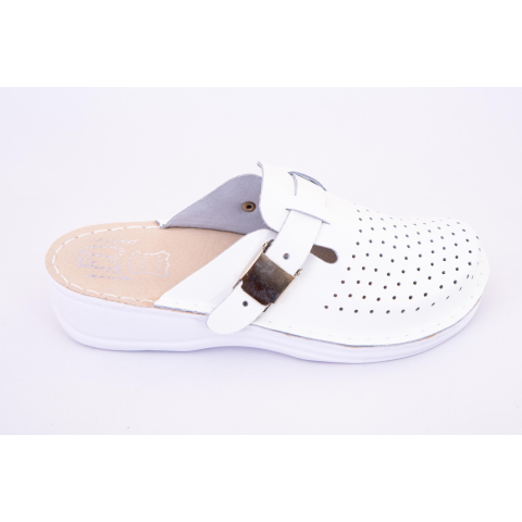 Ledi Anatomic Női Papucs LEDI-631-18. Színe: fehérA belső talp rész puha bőrből készült, alatta a láb anatómiájának megfelelő emeléseket, tartó pontokat,akupresszúrás pontokat ingerlő párnázat található, ami kényelmes akár 24 órás viselést is lehetővé tesz.A természetes bőrnek és a lyukakkal ellátott felső résznek köszönhetően a láb jól szellőzik, és nem izzad be.Viselése ajánlott mindkét nem részére, lábfáj