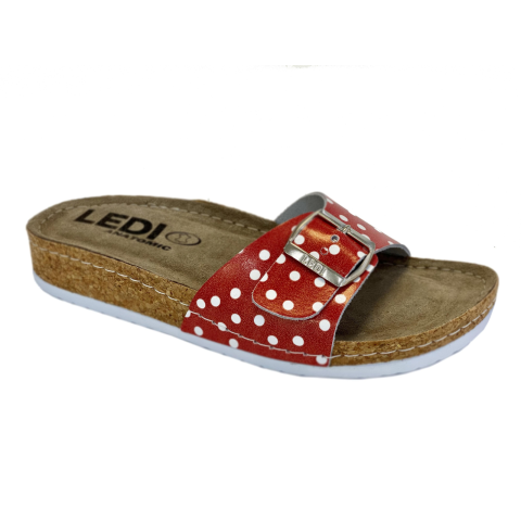 Ledi Anatomic Női Papucs LEDI-94-DOT. Színe: piros fehér pöttyösAnatómiailag tervezett, tartós, könnyű, parafa talp a láb igénybevételeit figyelem be véve készült és rugalmas járást tesz lehetővé. A belső talpbélés puha bőrből készült, komfortos és rugalmas alapot biztosít a fáradt, fájós láb számára. A talpágy kialakítása kényelmes akár 24 órás viselést is lehetővé tesz. Sarok fájdalomban szenvedők részére i