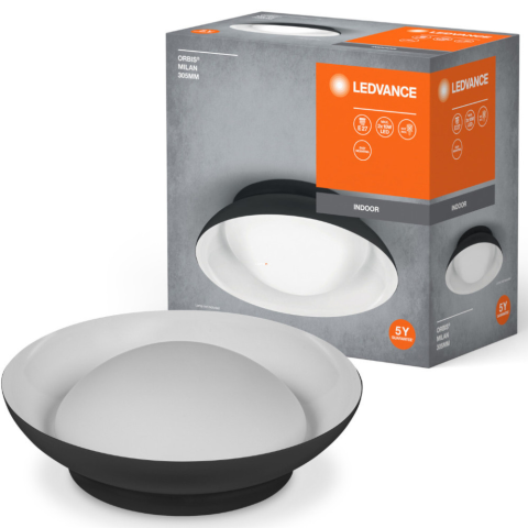 A Ledvance Orbis Milan mennyezeti lámpa két darab E27-es foglalattal rendelkezik, amelyek cserélhető fényforrások befogadására alkalmasak, lehetővé téve a fényáram, színhőmérséklet és teljesítmény egyéni igények szerinti kiválasztását. A lámpatest acélból
