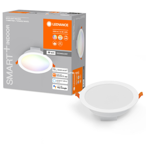 A Ledvance Smart+ WIFI Spot LED süllyesztett spot 17 cm átmérőjű, 12 W teljesítményű LED modullal működik, amely 1000 lumen fényáramot biztosít. A világítótest RGBW technológiával rendelkezik, így a fény színe és színhőmérséklete széles tartományban, 2700