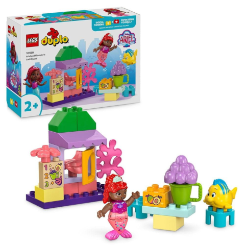LEGO - gyerekek részére, ajánlott 2 éveskortól, LEGO® DUPLO® | Disney sorozat, megjelenés éve 2024, 22 a csomagban db építőelem található LEGO® DUPLO®- Disney 10420 Ariel és Ficánka kávézójaAriel és a kis hal, FicánkaTalálkozz a kedvenc karaktereiddel, amelyeket a Disney Junior Ariel című filmjéből ismersz. Finomságok standjaArielnek és