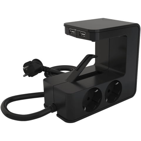 4x 2P+F csatlakozóaljzat 2x Usb-A csatlakozóaljzat Be/ki kapcsoló gomb, mely LED fénnyel megvilágított 90°-ban forgatható kábel 3x1,5 mm² (hossz 1.5m) Asztallapra felpattintható elosztó (max. bútorlap vastagság: 63 mm) Lehetővé teszi a csatlakozóaljzatok elrejtését az asztallap alatt, míg az USB csatlakozóaljzatok az asztallap felett vehetők igénybe.