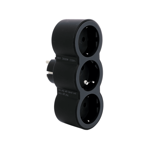 2P+F elosztódugók biztonsági zsaluval, 3 kimenettel 45°-os szögben elhelyezett középső kimenettel, valamint bal és jobb oldali kivezetések fordított bemélyedésekkel, hogy megkönnyítsék a készülékek csatlakoztatását.