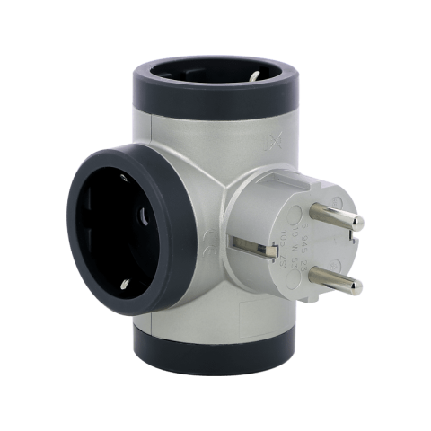 Kompakt 2P+F elosztódugó biztonsági zsaluval - 3 oldalsó kimenettel Schuko szabvány.
