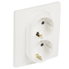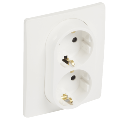 Földelt csatlakozóaljzat dupla kivitel, gyermekvédelemmel. Monoblock, kerettel egybeépített burkolat. Felszerelés egyes szerelődobozba, szimpla dugaszolóaljzat helyére építhető. Csavaros rögzítés.