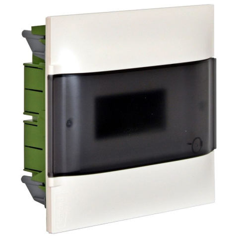 Legrand 134158 PractiboxS téglafalba süllyeszthető kiselosztó, 1 sor 8 modul, átlátszó füstszínű ajtóval, védőföld és nulla elosztókapoccsal