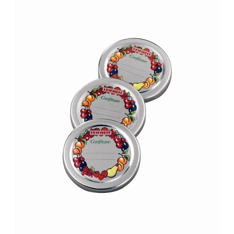 Leifheit Tetõ lekváros üveghez 10 db 36402 - Dekoratívan díszített csavaros tetõ ø66 mm - Cseretetõ Leifheit 1/4 l-es dzsemes üveghez és 167 ml-es befõttesüveghez - Valamennyi 66 mm-es nyílású üveghez használható - Egyedileg feliratozható, speciális bevonat -Tartalom: 10 darab