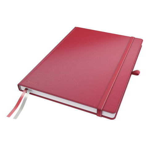 LEITZ COMPLETE BEÍRÓ FŐBB JELLEMZŐI: Formátum: A4 Kivitel: vonalas Méret: 217 x 20 x 297 mm Súly: 0,71 kg Lapszám: 80 lap Papírminőség: 100 g/m², csontszínű, FSC® minősített Kötés: keménykötés, bőrhatású borítóval Szín: piros Záródás: gumiszalagos Jelölők