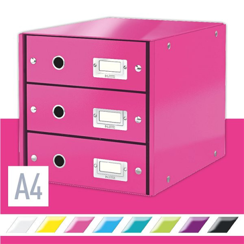 Fiókos doboz - A4-es dokumentumokhoz, 3 fiók, egymásra rakható, összecsukható, fém fogantyúk, keret a címkékhez, merev laminált karton, szín: rózsaszín, méret: 282 x 286 x 358 mm (Ma x Sz x Mé) A Leitz Click & A Store WOW fiók doboz biztosítja a dokumentumok, szerződések, levelek és egyéb iratok tökéletes rendszerezését az irodában, otthon vagy a dolgozószobában. Három fiókkal rende