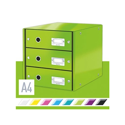 Fiókos doboz - A4-es dokumentumokhoz, 3 fiók, egymásra rakható, összecsukható, fém fogantyúk, keret a címkékhez, merev laminált karton, szín: zöld, méret: 282 x 286 x 358 mm (magasság x szélesség x mélység) A Leitz Click & A Store WOW fiók doboz biztosítja a dokumentumok, szerződések, levelek és egyéb iratok tökéletes rendszerezését az irodában, otthon vagy a dolgozószobában. Három fiókkal rende