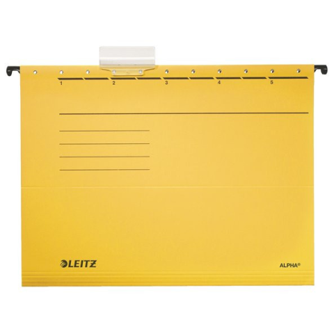 Függőmappa, karton, A4, LEITZ Alpha Standard, sárga - minőségi függőmappa V-alakú gerinccel és nyitott oldalakkal a különálló dokumentumok számára - mindennapi használatra alkalmas - lyukak az elő-és hátlapon lefűzőcsík rögzítéséhez - ragyogó színek a