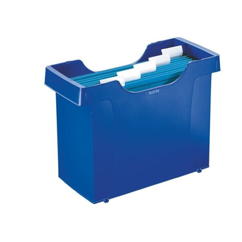 Függőmappa tároló, műanyag, 5 db függőmappával, Leitz Plus, kék klasszikus formájú függőmappatartó, amely fogantyújának köszönhetően könnyen hordozható kis helyet foglal, egymásra helyezhető a függőmappatartók egymásra helyezését a tartón kialakított