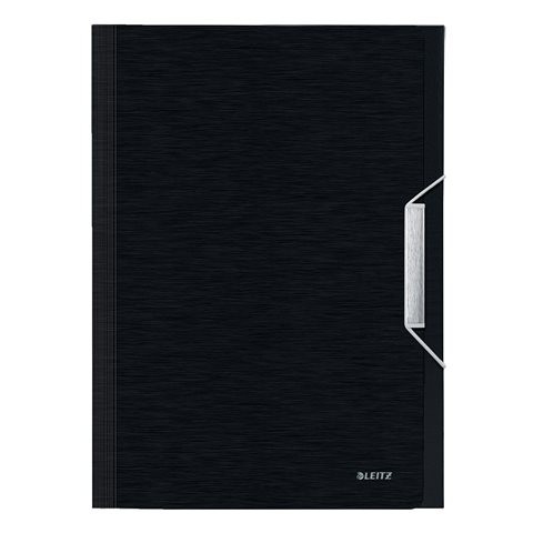 Harmonika mappa, A4, PP, 6 rekeszes, Leitz Style, szaténfekete kiváló minőségű PP harmonika irattartó egyedülálló, csiszolt fém mintázattal standard genotherm, Style jegyzetfüzet és Leitz CombiFile lefűzhető genotherm tárolására is alkalmas elülső rek