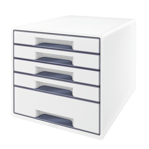 Irattároló, műanyag, 5 fiókos, Leitz Wow Cube, fehér/szürke - szembetűnő, minőségi megjelenésű fiókos irattároló ragyogó, stílusos színkombinációban fényes felülettel - a robosztus -Cube- fiókos irattároló tökéletesen illik a Leitz -Wow- termékcsal