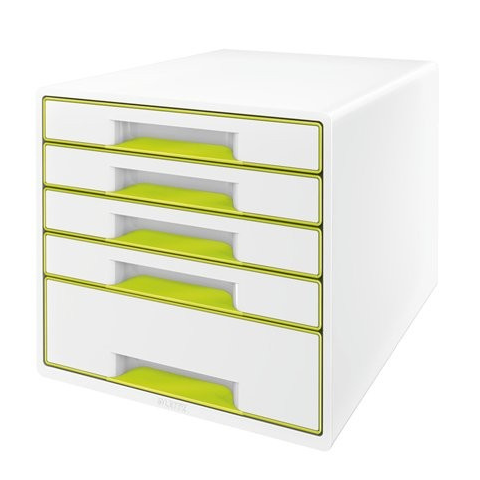 Irattároló, műanyag, 5 fiókos, Leitz Wow Cube, fehér/zöld - szembetűnő, minőségi megjelenésű fiókos irattároló ragyogó, stílusos színkombinációban fényes felülettel - a robosztus -Cube- fiókos irattároló tökéletesen illik a Leitz -Wow- termékcsalád töb