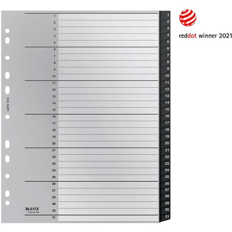 Regiszter - numerikusan rendszerező, lapok száma: 31, anyaga: polipropilén, fekete színű, 238 mm széles, 297 mm magas A Leitz RECYCLE regiszter lehetővé teszi az áttekinthető rendszerezést és a gyors tájékozódást a dokumentumokban, mappákban vagy a jegyzetpapírok között. A4-es formátumhoz készült, és 31 osztó számlap