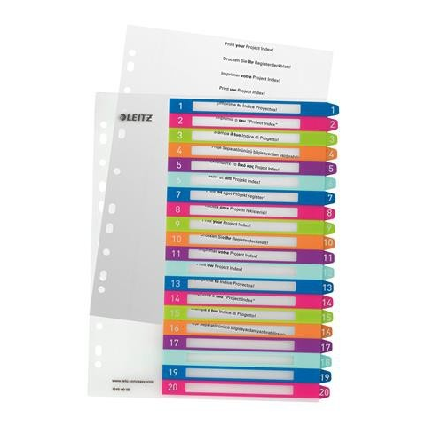 -vegyes színű regiszter -nagyméretű téglalapok az előlapon a tartalom feltüntetésére -1-20 felirattal rendelkező regiszter fülek a dokumentumok gyors eléréséhez -nyomtatható tárgymutató az egyedi igényekhez -megerősített lefűzőrész az előlapon hagyományos, 11-lyukú lefűzőrész -0,3 mm vastag PP alapanyag -az A4+ méret elválasztólapok regiszter része szélesebb, mint a standard lefűzhető tasakoké, így segítségükkel az iratrendezőbe lefűzött tasakok is kö