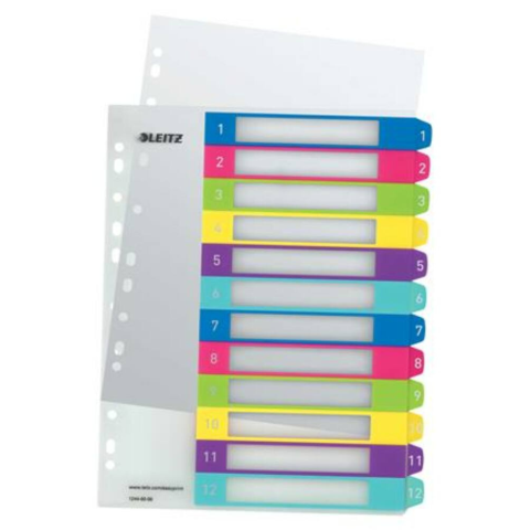 Regiszter, műanyag, A4 Maxi, 1-12, LEITZ Wow (E12440000) -vegyes színű regiszter -nagyméretű téglalapok az előlapon a tartalom feltüntetésére -1-12 felirattal rendelkező regiszter fülek a dokumentumok gyors eléréséhez -nyomtatható tárgymutató az egy