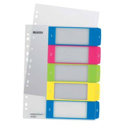 Regiszter, műanyag, A4 Maxi, 1-5, LEITZ Wow (E12410000) -vegyes színű regiszter -nagyméretű téglalapok az előlapon a tartalom feltüntetésére -1-5 felirattal rendelkező regiszter fülek a dokumentumok gyors eléréséhez -nyomtatható tárgymutató az egyed
