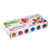A készletben a műanyag, 25 ml-s tégelyekben 12 különböző színű tempera található. A színek élénkek, jól fednek, papírra, fára való felvitelük könnyű.