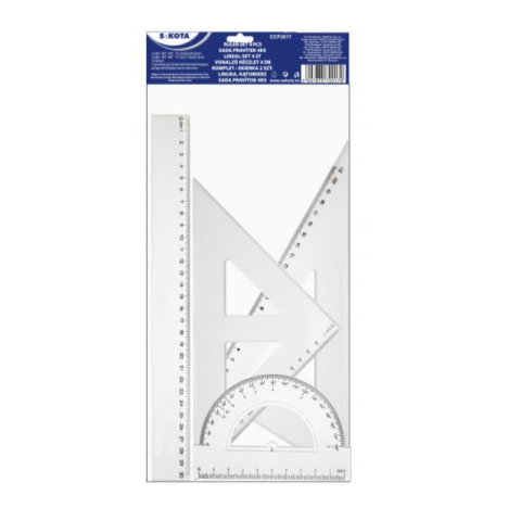 Az egyedi csomagolással ellátott készlet tartalmaz 1 db 45°-os, 21 cm-es számskálájú háromszög vonalzót, 1 db 60 °-os, 16 cm-es számskálájú háromszög vonalzót, 1 db 30 cm-es vonalzót és 1 db 180°-os, 10 cm-es szögmérőt. A vonalzók átlátszók, víztiszták.