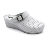 Női bőr klumpa, műanyag csúszásgátlós talppal. Oldalt csat található, amellyel szabályozni lehet a bőséget. A talpbetét puha zselés, bőr. A természetes anyagnak és a felsőrész lyukacsosságának köszönhetően, jól szellőzik. Ajánlott: mindennapos utcai használatra, otthonra vagy munkahelyre ( több órás, szaladgálós munka alatt sem fárad el a láb ).