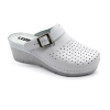 Női bőr klumpa, műanyag csúszásgátlós talppal. Oldalt csat található, amellyel szabályozni lehet a bőséget. A talpbetét puha zselés, bőr. A természetes anyagnak és a felsőrész lyukacsosságának köszönhetően, jól szellőzik. Ajánlott: mindennapos utcai használatra, otthonra vagy munkahelyre ( több órás, szaladgálós munka alatt sem fárad el a láb ).méret:40