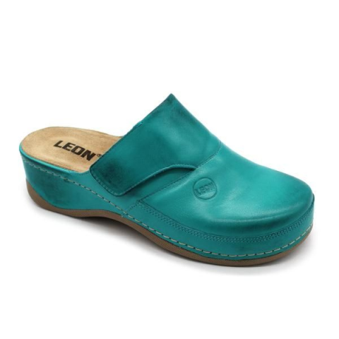 Leon Női Papucs 2019/T059. Színe: türkizDekoratív női nappabőr ( nagyon puha felsőrész ) klumpa, műanyag csúszásmentes talppal. A felsőrész bősége tépőzárral szabályozható. Az anatómiai kialakítású, puha bőr talpbetét kivehető, így bármikor tisztítható és cserélhető. Ajánlott: mindennapos utcai használatra, otthonra vagy munkahelyre ( több órás, szaladgálós munka alatt sem fárad el a láb ).