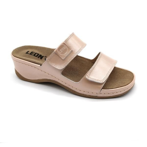 Leon Női Papucs 2020/T086. Színe: losos Dekoratív női nappabőr ( nagyon puha felsőrész ) papucs, műanyag csúszásmentes talppal. A felsőrész mindkét pántja tépőzárral szabályozható. Az anatómiai kialakítású, puha bőr talpbetét kivehető, így bármikor tisztítható és cserélhető. Ajánlott: mindennapos utcai használatra, otthonra vagy munkahelyre ( több órás, szaladgálós munka alatt sem fárad el a láb ). 2020/T086