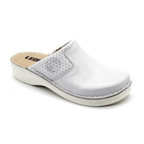 Leon Női Papucs 360/T013. Színe: fehér Női nappa bőr (nagyon puha felsőrész) klumpa, műanyag csúszásgátlós talppal. A felsőrész bemeneti nyílásánál, szivacsos szegő található, a komfortosabb érzetért. Ajánlott: mindennapos utcai használatra, otthonra vagy munkahelyre ( több órás, szaladgálós munka alatt sem fárad el a láb ). 360/T013