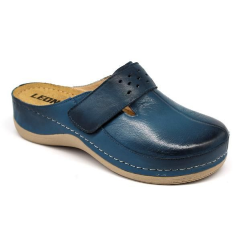 Leon Női Papucs 902/T001. Színe: kékNői nappa bőr (nagyon puha felsőrész) klumpa, műanyag csúszásgátlós talppal. Oldalt tépőzár található, amellyel szabályozni lehet a bőséget. A talpbetét puha zselés, bőr. A természetes anyagnak köszönhetően jól szellőzik. Ajánlott: mindennapos utcai használatra, otthonra vagy munkahelyre ( több órás, szaladgálós munka alatt sem fárad el a láb ). 902/T001