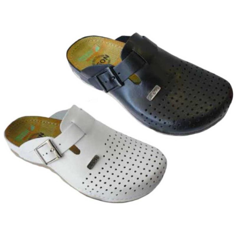 Férfi bőr klumpa, műanyag csúszásgátlós talppal. Oldalt fém csat található, amellyel szabályozni lehet a bőséget. A természetes anyagnak és a felsőrész lyukacsosságának köszönhetően, jól szellőzik. Ajánlott: mindennapos utcai használatra, otthonra vagy munkahelyre ( több órás, szaladgálós munka alatt sem fárad el a láb ).