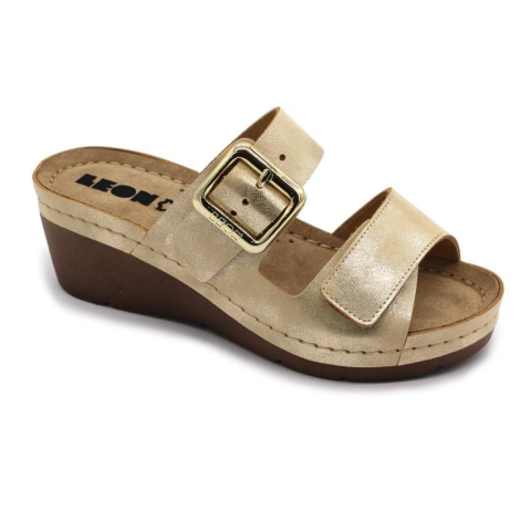 Leon Női Papucs 1110/T016. Színe: arany Női bőr nyitott papucs, műanyag talppal. Mind a felső szíj csattal, az alsó szíj tépőzárral szabályozható. A talpbetét puha, zselés, bőr. Ajánlott: mindennapos utcai használatra, otthonra vagy munkahelyre ( több órás, szaladgálós munka alatt sem fárad el a láb ). 1110/T016