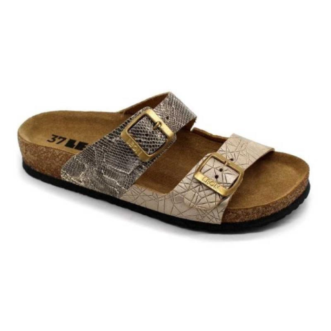 Női nyitott, bőr papucs. A felsőrész, a csatoknak köszönhetően, a lábhoz igazítható. A talp anatómiai kialakítású parafa, puha velúrbőr talpbetéttel és csúszásmentes habszivacs alsó résszel. Ajánlott minden napos otthoni vagy utcai használatra, könnyű nyári sétára ( több órás gyaloglás után sem fárad el a láb ).