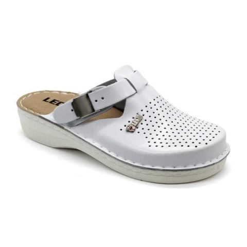 Leon Női Papucs V260/T013. Színe: fehérNői bőr klumpa, műanyag csúszásgátlós talppal. Oldalt fém csat található, amellyel szabályozni lehet a bőséget. A talpbetét puha zselés, bőr. A természetes anyagnak és a felsőrész lyukacsosságának köszönhetően, jól szellőzik. Ajánlott: mindennapos utcai használatra, otthonra vagy munkahelyre ( több órás, szaladgálós munka alatt sem fárad el a láb ). Ez a termékünk rendelkezik mi