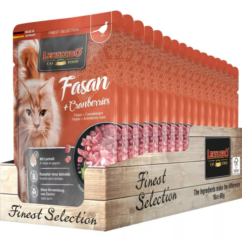 Leonardo fácánhús tőzegáfonyával 13x85g + 3db ajándék macskaeledel árgrafikon