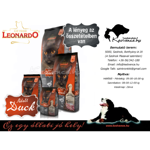 Extra friss kacsahúsban gazdag alternatíva macskáknak! Könnyen emészthető különleges ízvilág A nagyon válogatós cicák is imádják Hosszú szőrű macskák számára is ajánlott Természetes öregedésgátló a szív, a keringés és az életerő számára Leonardo Szár