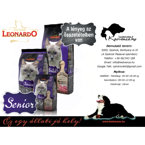 Extra friss baromfihúsban gazdag Csökkentett energiatartalom a jó alak érdekében A chia mag speciális rostjai csökkentik a székrekedést Leonardo SeniorCsirkehúsos száraz macskaeledel 10 évnél idősebb cicáknak.Ha macskája évei lassan eltelnek, megválto