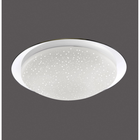 A kerek SKYLER mennyezeti lámpa elvarázsol lenyűgöző csillagos égbolt megjelenésével. A krómozott acél és műanyag kombinációjából készült, és a búrában lévő sok kis áttetsző pontnak köszönhetően úgy tűnik, mintha kis csillagok ragyognának. Egy fixen beépített 11 W-os LED-izzót tartalmaz. Az izzó körülbelül 1200 lumennel világít, és a színhőmérséklet 3000, 4500 és 6000 Kelvin fokozatra állítható a villanykapcsoló többszöri megnyomásával. Így