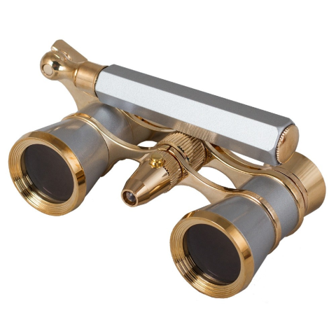 Levenhuk Broadway 325N színházi látcső (LED-lámpával ellátott ezüst színű lornyon) Szín: ezüst arannyal Levenhuk Broadway 325N termékcsalád – elegáns színházi lornyon LED-világítással. A teleszkópos fogantyú segítségével könnyedén állítható a magasság, így az eszköz maximális kényelmet nyújt. Mindegyik modellhez tartozik egy puha tárolótok és egy tisztítókendő az optikai elemekhez. A csomagolás színházi témájú külsőt kapott. A fémből készül