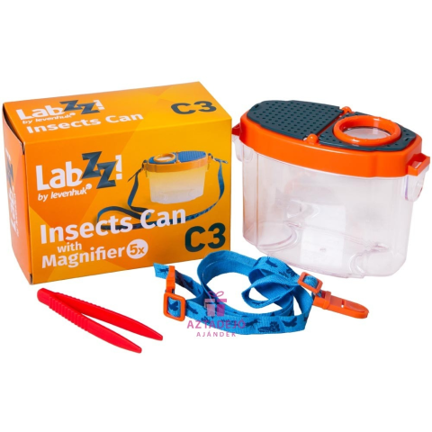 Levenhuk LabZZ C3 rovarmegfigyelő dobozNagyítás foka: 5х. Átmérője: 38 mm. 3–12 éves gyermekek számára.A Levenhuk LabZZ C3 rovarmegfigyelő doboz kifejezetten ifjú természetvizsgálók számára készült. Az átlátszó tároló 5x-ös nagyítást biztosít a fedélen. A tárolóba kisebb objektumok (pl. kavicsok, talajminta, növények vagy rovarok) helyezhetők, ahol a nagyító segítségével azok részletesen megfigyelhetők. Ezen kívül némi vízzel feltöltve halat vagy e