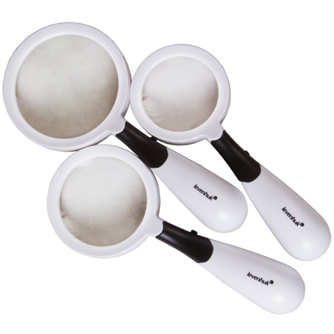 Levenhuk Zeno Multi ML13 nagyító Három különböző nagyítású és átmérőjű nagyítóból álló készlet. LED-világítás. Nagyítás: 2/3/4x A Levenhuk Zeno Multi ML13 nagyító három kézi nagyítót tartalmaz egy készletben. A nagyítók nagyítása és átmérője különböző: mindig kiválaszthatja az adott feladathoz illőt. A kis nagyítás és nagy átmérő nagyszerűen használható olvasáshoz; az erős nagyítás és kis vizsgált terület az apró tárgyak vizsgálat