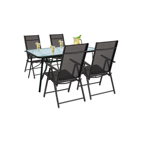Nadin 4+1 kerti bútor garnitúra szett Nadin 4+1 kerti bútor garnitúra szett feketeA garnitúra tartalmaz egy téglalap alakú, 150x90 cm-es üvegasztalt, valamint négy Lugo összecsukható fémvázas kerti széket, amelyek 7 különböző pozícióba állíthatók, hogy