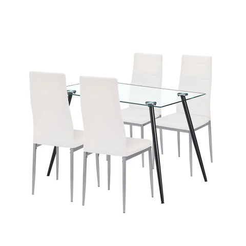 Nash 4+1 étkező garnitúra fehér-szürke Nash 4+1 étkezőgarnitúra – Modern stílus fehér-szürke székekkel és edzett üvegasztallalAsztal mérete: 120 × 70 × 75 cmAsztallap: 8 mm vastag, hőkezelt, edzett üvegAsztal lábai: Fekete porfestett fém, padlóvédő műa