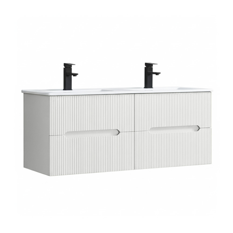 Leziter Trent Fürdőszobabútor 120 cm kerámia mosdóval (4 fiókos) Fehér - FehérBútor:Szélesség: 120 cmMélység: 45 cmMagasság: 48 cmKivitel: fali függesztésFront: 18 mm MDF, PVC fóliávalKorpus: 15 mm MDF, melamin borítássalNyitás: rejtett, integrált fogantyúFiókok: 4 db, teljesen kihúzható, soft-close rendszerrelFelső fiók: U-alakú kivágás a szifon számáraSzín: Fehér-FehérLapra szerelve szállítjukMosdó:Anyaga: fényes fehér kerámiaKönnyen tisztíthatóKa