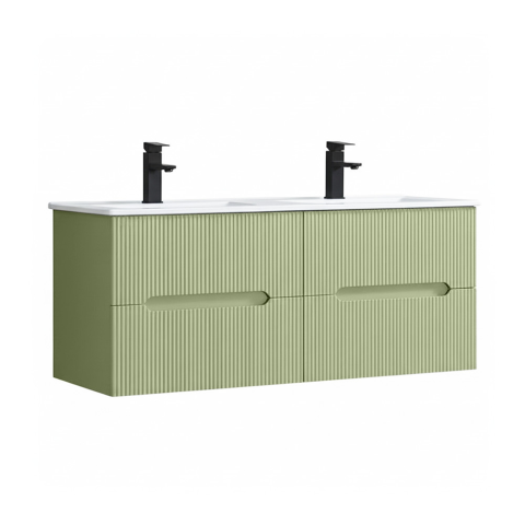 Leziter Trent Fürdőszobabútor 120 cm kerámia mosdóval (4 fiókos) Világos zöld - Világos zöldBútor:Szélesség: 120 cmMélység: 45 cmMagasság: 48 cmKivitel: fali függesztésFront: 18 mm MDF, PVC fóliávalKorpus: 15 mm MDF, melamin borítássalNyitás: rejtett, integrált fogantyúFiókok: 4 db, teljesen kihúzható, soft-close rendszerrelFelső fiók: U-alakú kivágás a szifon számáraSzín: Világos zöld-Világos zöldLapra szerelve szállítjukMosdó:Anyaga: fényes fehér