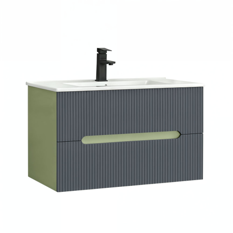 Leziter Trent Fürdőszobabútor 80 cm kerámia mosdóval (2 fiókos) Világos zöld - Antracit szürkeBútor:Szélesség: 80 cmMélység: 45 cmMagasság: 48 cmKivitel: fali függesztésFront: 18 mm MDF, PVC fóliávalKorpus: 15 mm MDF, melamin borítássalNyitás: rejtett, integrált fogantyúFiókok: 2 db, teljesen kihúzható, soft-close rendszerrelFelső fiók: U-alakú kivágás a szifon számáraSzín: Világos zöld-Antracit szürkeLapra szerelve szállítjukMosdó:Anyaga: fényes fehé